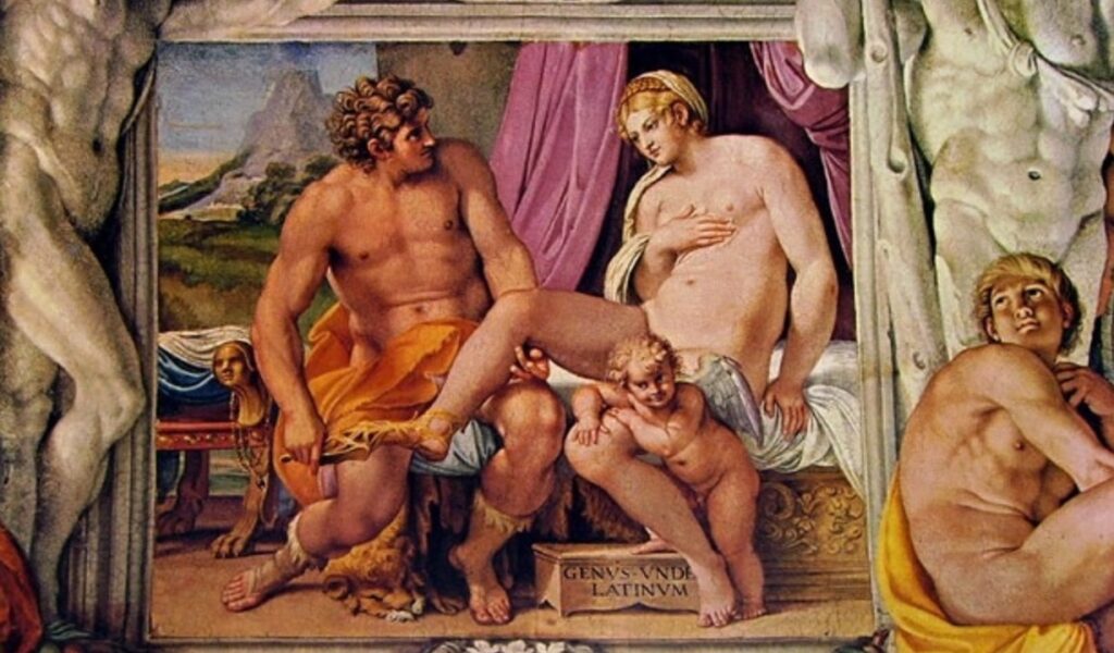 Alcuni studiosi hanno voluto collegare il dipinto murale al matrimonio di Ranuce Farnese, fratello del cardinale Edoardo Farnese, e Margherita Aldobrandini. La scritta “Genus unde Latinum” (Eneide, I, 6) ricondurrebbe l’unione delle due nobili famiglie alla grandezza di Roma. Qualcuno vi ha visto anche un’allusione ironica: un augurio agli sposi di generare una prole destinata a grandi gesta attraverso il riferimento alla legenda della notte trascorsa tra Afrodite e il giovane Anchise nella regione della Troade.